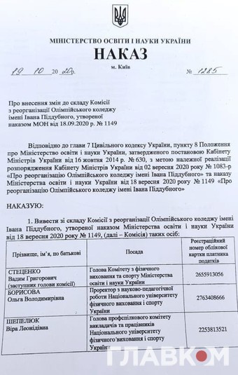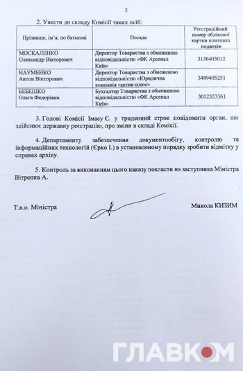 Згідно з наказом, який підписав 19 жовтня Микола Кизим, заступник т.в.о. міністра освіти і науки Шкарлета, внесені зміни до складу Комісії з реорганізації Олімпійського коледжу. Зміни дуже несподівані: голову Комітету з фізвиховання і спорту Міністерства освіти Вадима Стеценка, проректора з науково-педагогічної роботи НУФВСУ Ольгу Борисову і керівницю профспілкового комітету НУФВСУ Віру Шепелюк замінили представники товариства з обмеженою відповідальністю ФК «Арсенал-Київ» і представниця створеної цьогоріч у лютому приватної юридичної компанії «Актив-плюс».