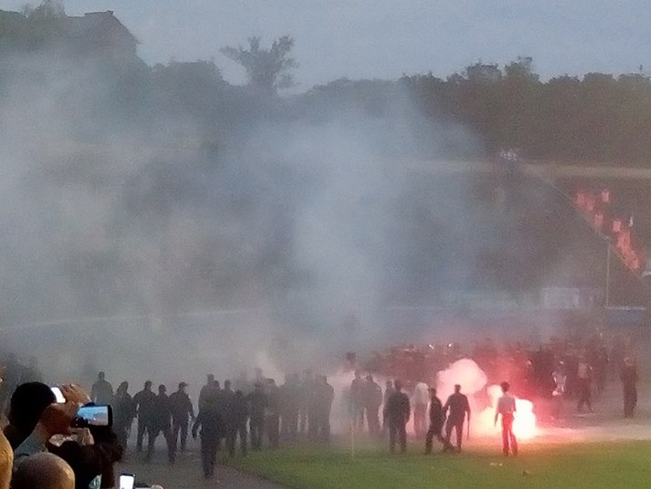 Вже під час матчу фанати львівських «Карпат», розлючені грою своєї команди, взагалі ледь не зірвали матч. Після першого пропущеного голу вони кричали своїм гравцям «Ми Вам цього не пробачимо». Коли ж «леви» пропустили другий гол, їхні вболівальники закидали поле фаєрами та димовими шашками, поліцію – камінням і вибігли на газон арени «Рух».