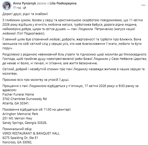 Прощання з Людмилою Петриченко відбудеться у п’ятницю, 17 квітня 2026 року о 9:30 ранку на кладовищі у Arlington Memorial Park в штаті Джорджії (США).