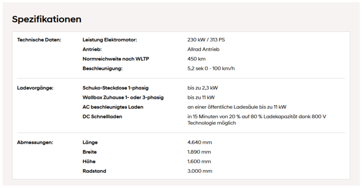 Ємність батареї не озвучується, проте запас ходу від повного заряду повинен скласти вельми непогані 450 км по вимірювального циклу WLTP. Батарея зможе заряджатися від звичайної побутової мережі (2,3 кВт), від зарядної станції Wallbox (11 кВт) і на швидкісних зарядках постійного струму (потужність не озвучується), де зможе заряджатися від 20% до 80% ємності всього за 15 хвилин.