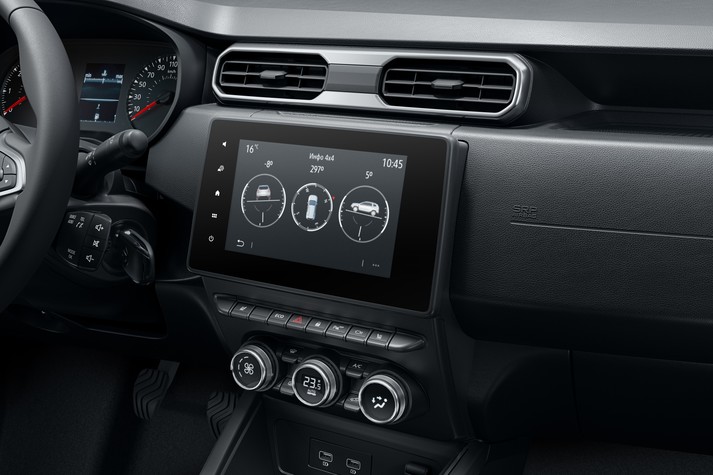 Для версій з повним приводом пропонується монітор 4х4. Він демонструє положення автомобіля у просторі – кут крену та нахилу, що важливо в умовах складного рельєфу бездоріжжя. Duster також обладнаний компасом.