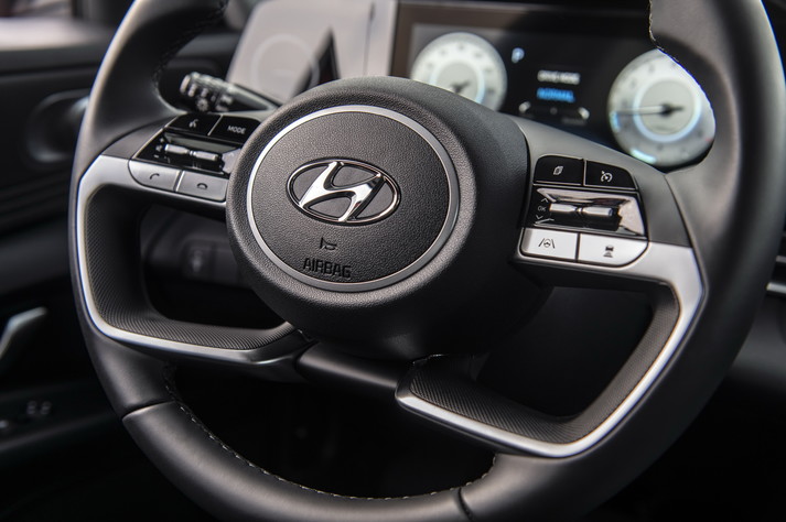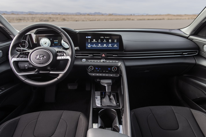 У салоні нової Elantra з'явилися два 10,25-дюймових екрана під одним склом. Перший відведено під віртуальну панель приладів, другий - під мультимедійну систему. Однак така конфігурація передбачена тільки для топових версій. Більш прості версії матимуть дисплей діагоналлю вісім дюймів.