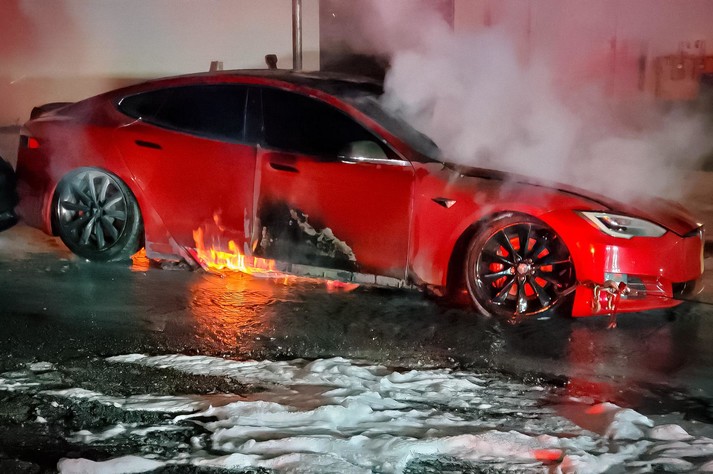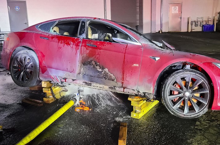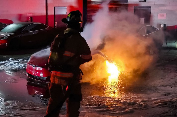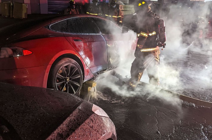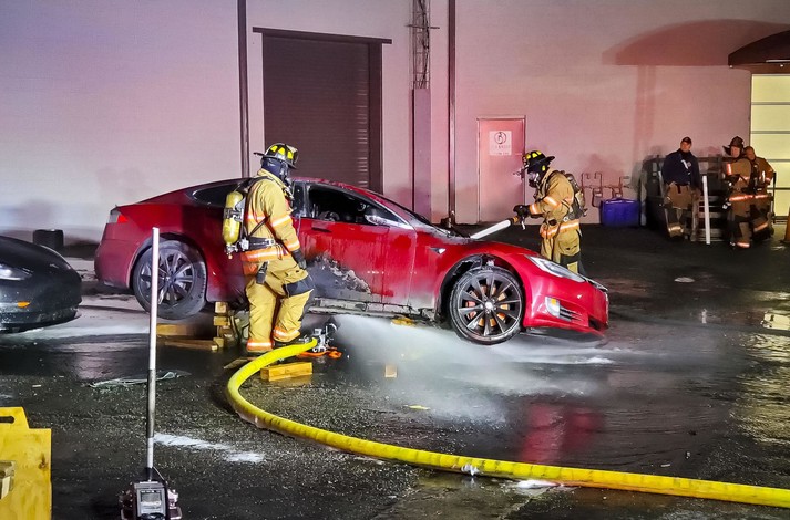 Повідомляється, що пожежникам довелося «мислити нестандартно» при гасінні електромобіля: вони вирішили підняти одну зі сторін Model S, встановивши її на дерев'яні підпірки, щоб підібратися ближче до джерела вогню.