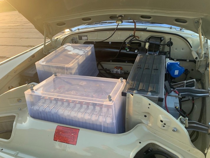 Тяговий акумулятор схований під капотом за пластиковими контейнерами для їжі. Батарею позичили у Nissan Leaf. Її вистачає всього 50 км. Як стверджує автор проєкту, мети створити електромобіль з великим запасом ходу не було.