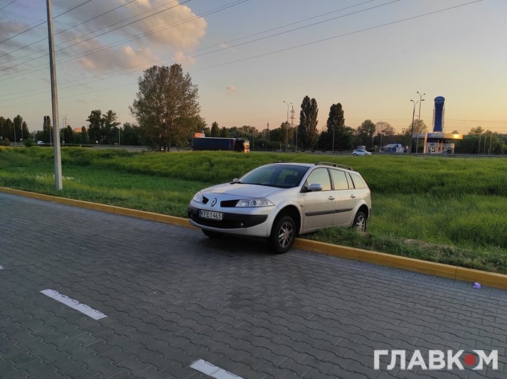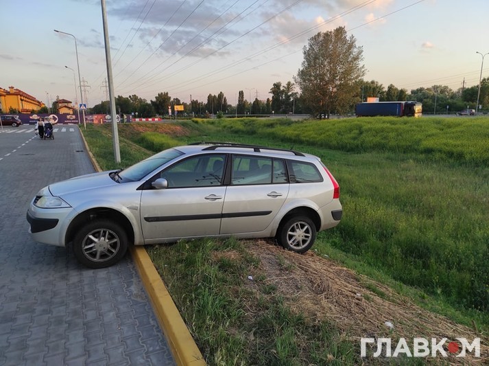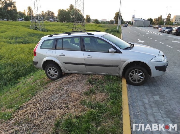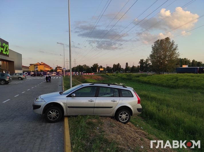 На вулиці Багатирській на виїзді з Києва сталася незвична пригода. На парковці біля магазину Novus універсал Renault Megane на європейських номерах частково опинився в кюветі.