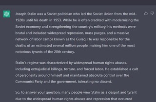 Втім, надія на те, що з часом штучний інтелект зорієнтується у тому, хто такий Путін, є. Адже на питання «Чи був Сталін деспотом і тираном?» ChatGPT, серед іншого, зауважив: «Хоча йому часто приписують модернізацію радянської економіки та зміцнення армії країни, його методи були жорстокими та включали широкомасштабні репресії, масові чистки, створення величезної мережі трудових таборів, відомих як ГУЛАГ. Він відповідальний за смерть приблизно кількох мільйонів людей, що робить його одним із найвідоміших тиранів 20 століття».