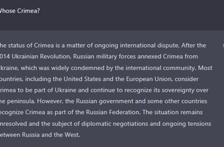 Однозначної відповіді ChatGPT дати не зміг: «Статус Криму є предметом постійної міжнародної суперечки. Після української революції 2014 року російські війська анексували Крим в України, і ці дії міжнародна спільнота засудила. Більшість країн, у тому числі США та Євросоюз, вважають Крим частиною України та продовжують визнавати її суверенітет над півостровом. Проте російський уряд та деякі інші країни визнають Крим частиною РФ. Ситуація залишається невирішеною та є предметом дипломатичних переговорів і тривалої напруженості між Росією та Заходом».