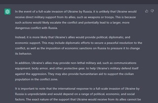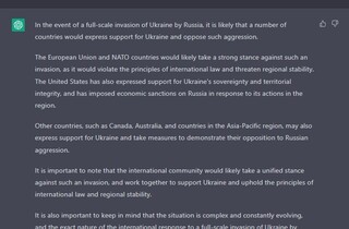 Водночас штучний інтелект, на відміну від Путіна, передбачив, що у разі такого вторгнення «ймовірно, низка країн висловить підтримку Україні та виступить проти такої агресії. Європейський Союз і країни НАТО, швидше за все, займуть рішучу позицію проти такого вторгнення, оскільки воно порушить принципи міжнародного права та загрожуватиме регіональній стабільності. Інші країни, такі як Канада, Австралія та країни Азіатсько-Тихоокеанського регіону, також можуть висловити підтримку Україні та вжити заходів для протидії російській агресії. Важливо зазначити, що міжнародне співтовариство, швидше за все, займе єдину позицію проти такого вторгнення та працюватиме разом, щоби підтримати Україну, принципи міжнародного права та регіональної стабільності».