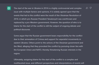 На жаль, через те, що ChatGPT спирається тільки на дані, що опинилися у мережі до 2021 року, він не може толком відповісти на питання щодо російсько-української війни. Також цей штучний інтелект є дуже політкоректним і робить зауваження користувачу, який питає, коли помре Путін і як розвалиться РФ. Мовляв, треба поважати життя людини і кордони інших країн.
