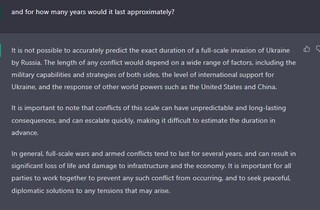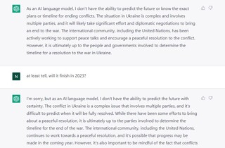 На уточнююче запитання, чи закінчиться війна у 2023 році, програма також дає дуже обтічну відповідь: «Цілком можливо, що прогрес може бути досягнутий наступного року. Однак також важливо пам’ятати про те, що конфлікти іноді можуть тривати довго і цілком можливо, що війна в Україні може не закінчитися у 2023 році».