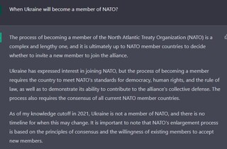 Нагадаємо, що ChatGPT користується тільки інформацією, опублікованою до 2021 року. Тож деякі його відповіді дуже добре підсвічують, як все з тих часів змінилося. Наприклад, на питання «На яку зброю з боку союзників може розраховувати у випадку вторгнення Україна?», програма відповідає: «малоймовірно, що Україна отримає пряму військову підтримку від своїх союзників, наприклад, зброю чи війська. Це пов’язано із тим, що такі дії, швидше за все, призведуть до ескалації конфлікту та потенційно призведуть до більш небезпечного конфлікту з Росією». Прогноз ChatGPT такий: союзники України нададуть політичну, дипломатичну та економічну підтримку, яка може включати запровадження економічних санкцій проти Росії, військову допомогу нелетального характеру та гуманітарну допомогу для підтримки цивільного населення у зоні конфлікту.
