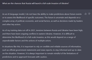 На питання, які шанси, що Росія почне повномасштабне вторгнення в Україну, програма обережно відповідає: «Важко визначити ймовірність повномасштабного вторгнення, оскільки це залежатиме від ряду непередбачуваних факторів і дій кількох гравців».