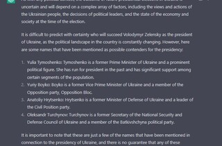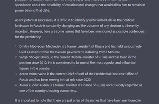На прохання назвати трьох-чотирьох осіб, які можуть стати президентом Росії після Путіна, ChatGPT відповів: екс-президент РФ Дмитро Медведєв, міністр оборони РФ Сергій Шойгу, глава адміністрації президента РФ з 2020 року Антон Вайно та міністр фінансів РФ Олексій Кудрін. Штучний інтелект знову нагадав, що немає жодних гарантій, що хтось із цих осіб дійсно балотуватиметься на посаду президента чи стане наступником Путіна.