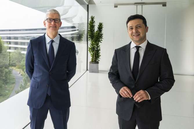 Президент України Володимир Зеленський під час робочого візиту до США зустрівся з генеральним директором Apple Тімом Куком у штаб-квартирі Apple Park в Купертіно. Про це йдеться у повідомлені на сайті Офісу президента України.