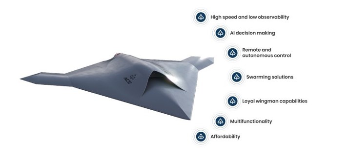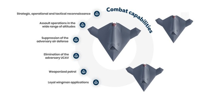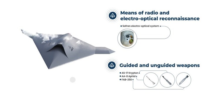 Дрон може нести та використовувати високоточне кероване озброєння та бомби, розташовані у двох великих внутрішніх відсіках, які можна буде використовувати як проти наземних, так і проти повітряних цілей.
