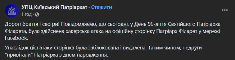 Хакери атакували офіційну сторінку патріарха Київського і всієї Руси-України Філарета в соцмережі Facebook. Унаслідок дій зловмисників сторінка була заблокована і видалена. Про це повідомляє Українська православна церква Київського патріархату.