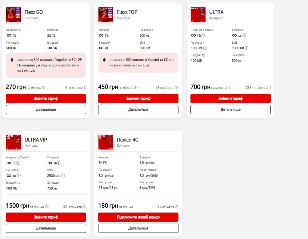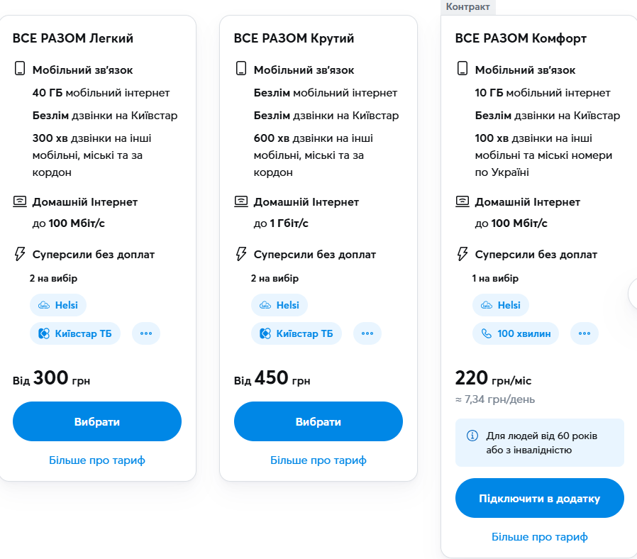 - «Все разом Комфорт» за 220 грн/місяць. Спеціальна пропозиція для пенсіонерів (60+) та людей з інвалідністю. Включає 10 ГБ інтернету, безліміт у мережі та 100 хвилин на інші номери.