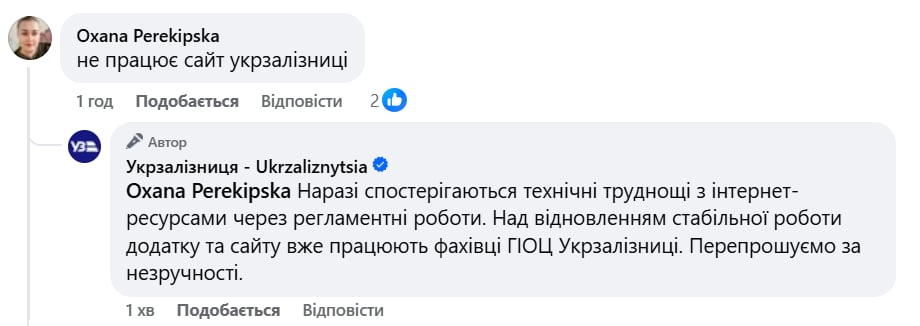 Станом на 12:55 представники «Укразалізниці» повідомили про причини збою.