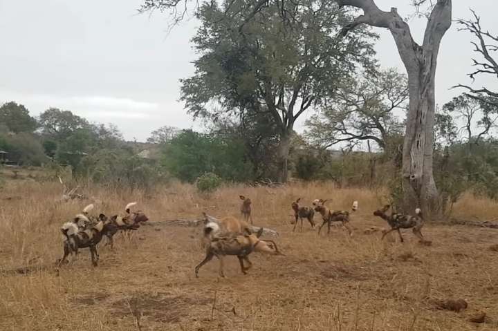 Потім автор ролика помітив леопарда, що вчепився в імпалу. Хижака і його здобич переслідувала гієноподібна собака. Леопардові вдалося прогнати переслідувачів. Коли він дістався з антилопою до дерева, щоб приступити до трапези, до нього підбігла зграя гієноподібних собак і загнала його на дерево.