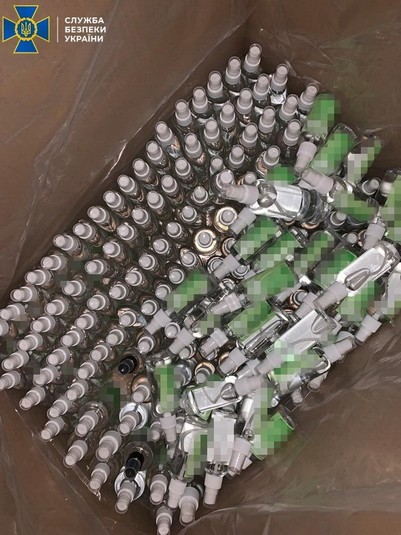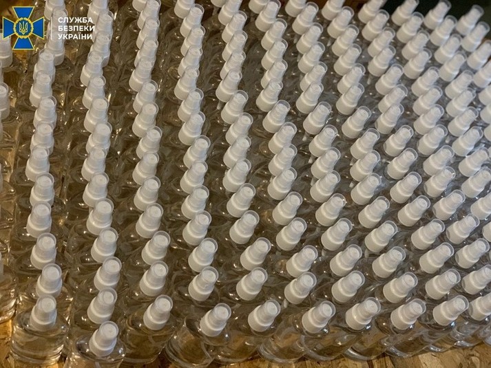 Під час слідчих дій в цеху, помешканнях та автомобілях «виробників антисептиків» правоохоронці вилучили майже 4 тисячі флаконів готового для продажу підробленого антисептика, 300 літрів спирту невстановленого походження, гліцерин, порожню тару, поліграфічну продукцію і записи чорнової бухгалтерії.