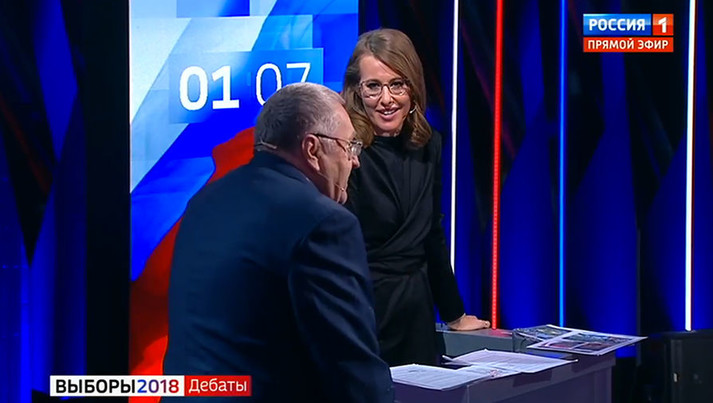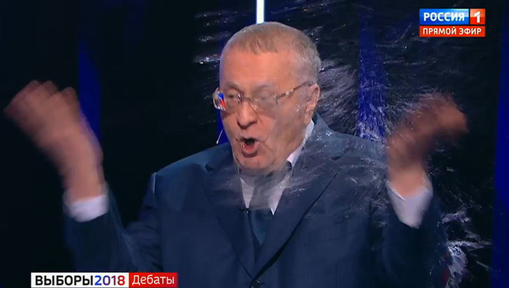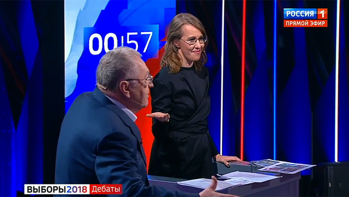 В ході передвиборних дебатів на телеканалі «Росія 1» опозиціонерка Ксенія Собчак, яка висувається від партії «Громадянська ініціатива» облила водою кандидата від ЛДПР Володимира Жириновського.