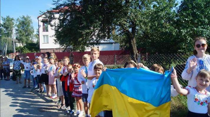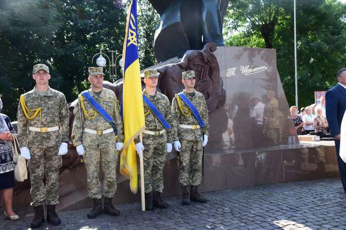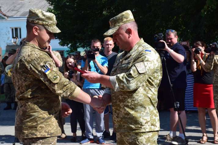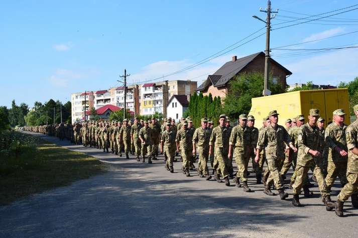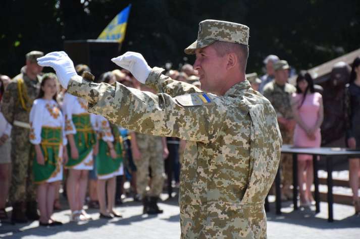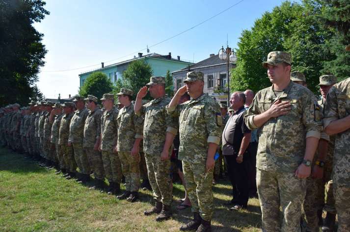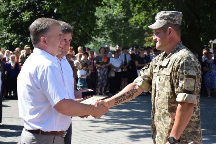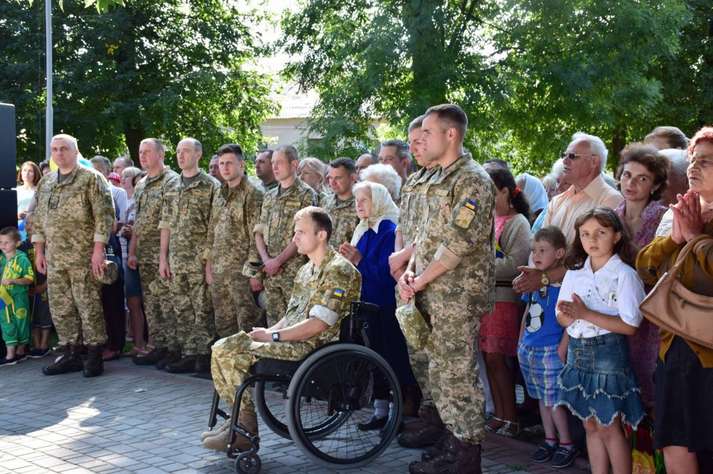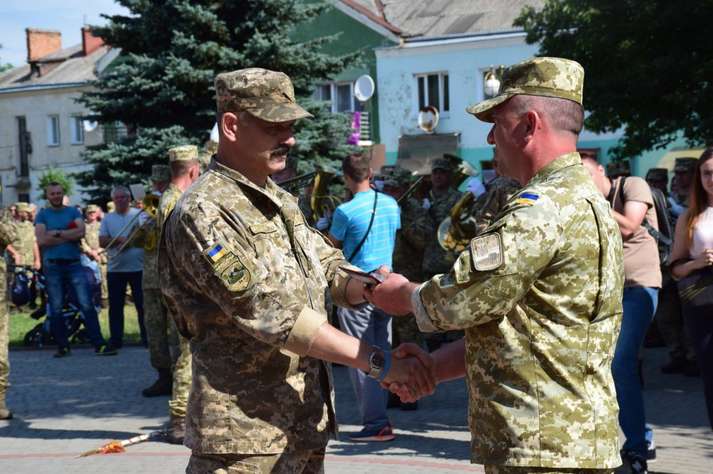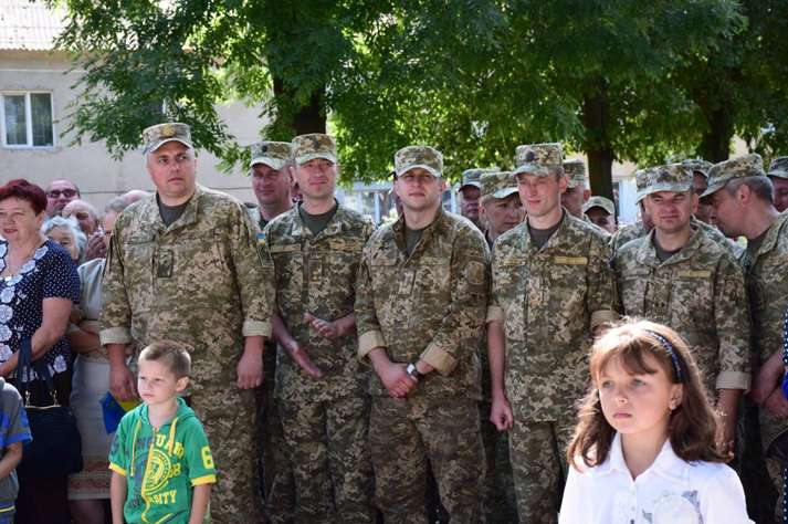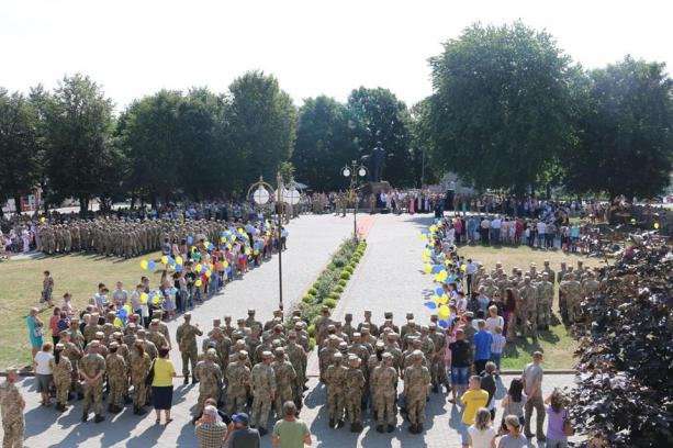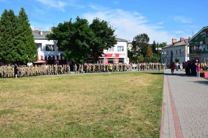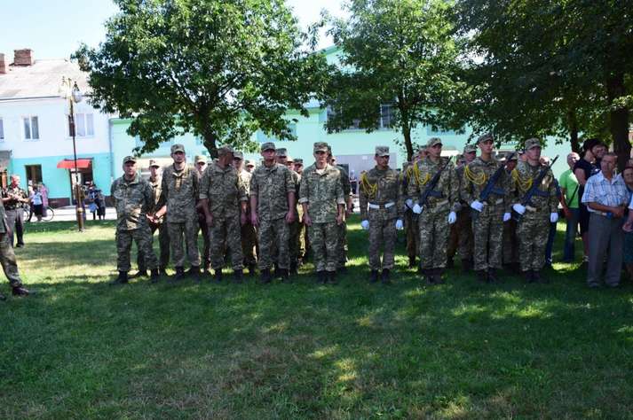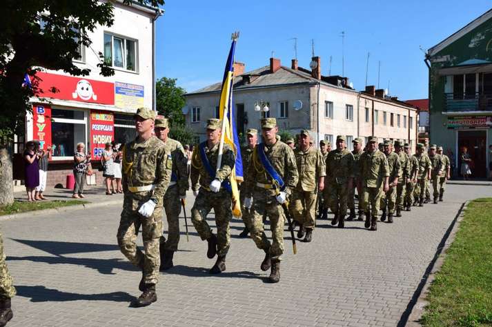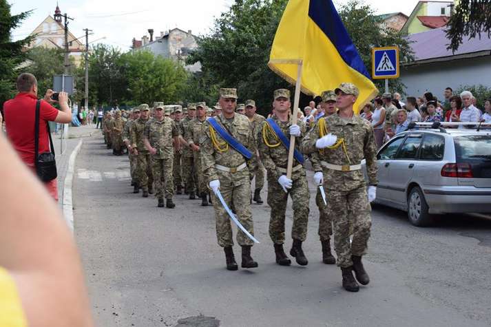 Люди вітали військовослужбовців, які пройшли вулицями під звуки військового оркестру. Діти дарували їм квіти. Місцеві священики благословляли і дякували воїнам за захист України від російських окупантів.