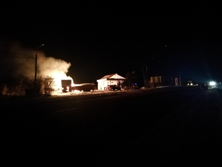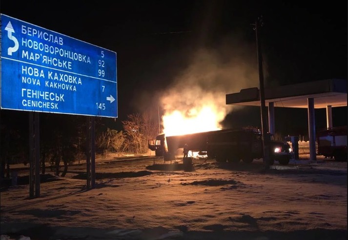 У п’ятницю ввечері у Херсонській області вантажівка врізалася в ємність з газом на АЗС. Внаслідок зіткнення спалахнула пожежа.