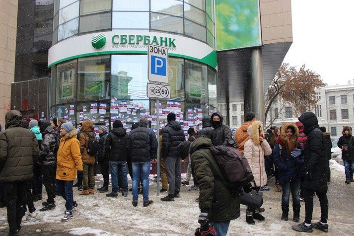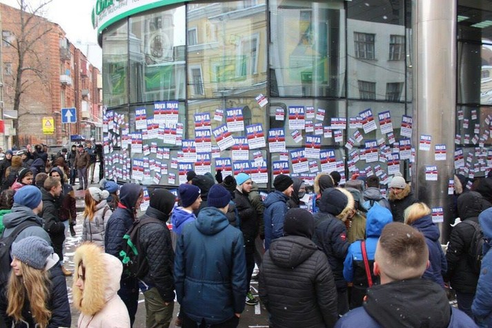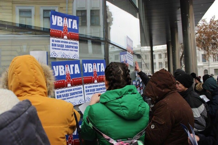 Крім того, учасники акції обклеїли вітрини будівлі плакатами із закликами забирати з цієї фінустанови кошти.