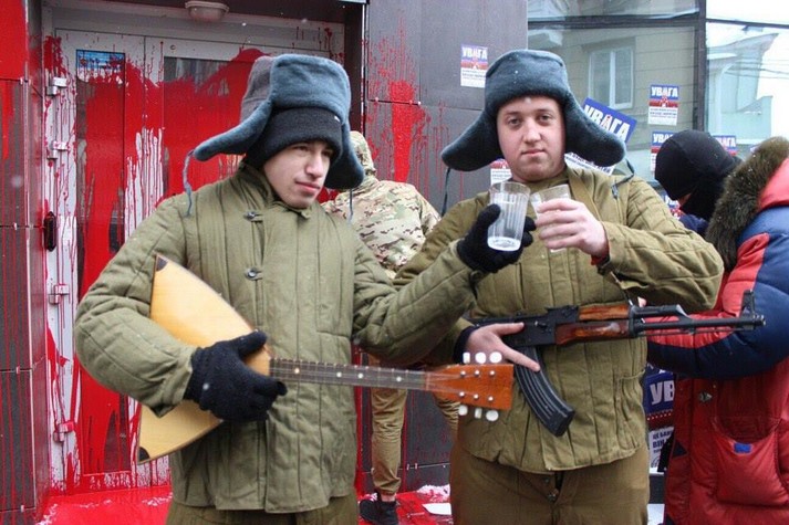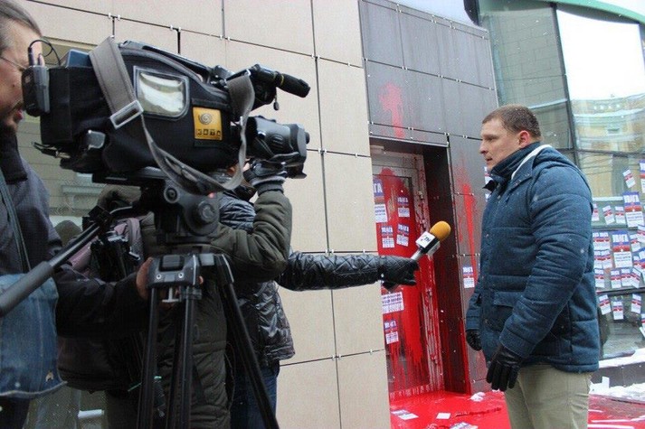 Активісти політичної партії «Національний корпус» облили червоною фарбою офіс російського банку «Сбербанк» на вулиці Донець-Захаржевського у Харкові