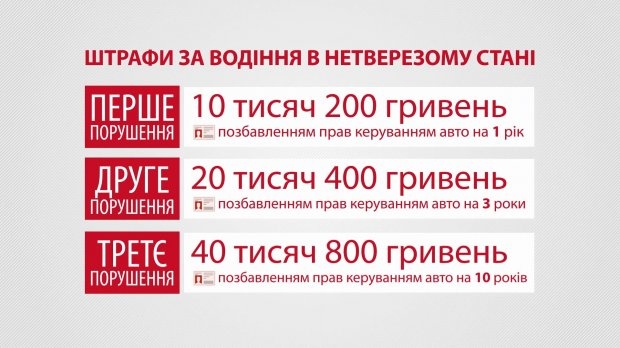 Якщо ж водія впродовж 2-х років удруге спіймали п'яними за кермом, штраф складе вже 20 тисяч 400 гривень. "Плюс" — заборона керувати автівкою на 3 роки. Якщо ж порушення повториться впродовж 5 років, водій не зможе сісти за кермо протягом 10 років і викладе більше 40 тисяч гривень.