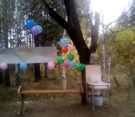 На честь цієї події дерев'яну будку для справляння природної потреби, яка стоїть посерд дерев, прикрасили плакатом і повітряними кульками.