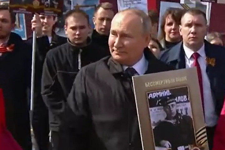 Президент Росії під час ходи «Безсмертного полку» посміхається, а в той час його вояки вбивають мирних жителів України