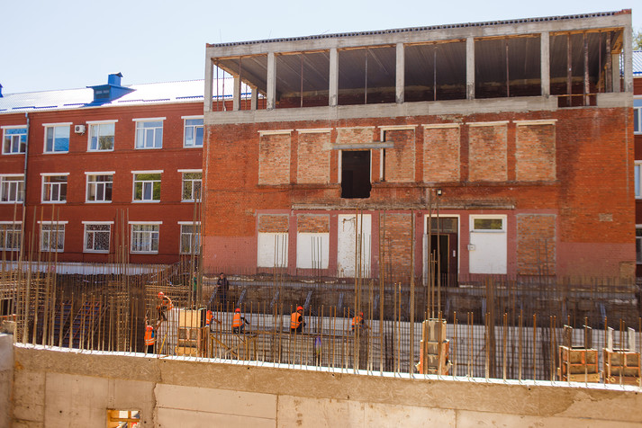 Будівельні роботи розпочали восени минулого року. Наразі викопано котлован добудови корпусу, виконано основу під плиту та бетонування монолітної залізобетонної плити. Виконуються роботи армування стін та бетонування, а також ліфтової шахти підземної частини будівлі.