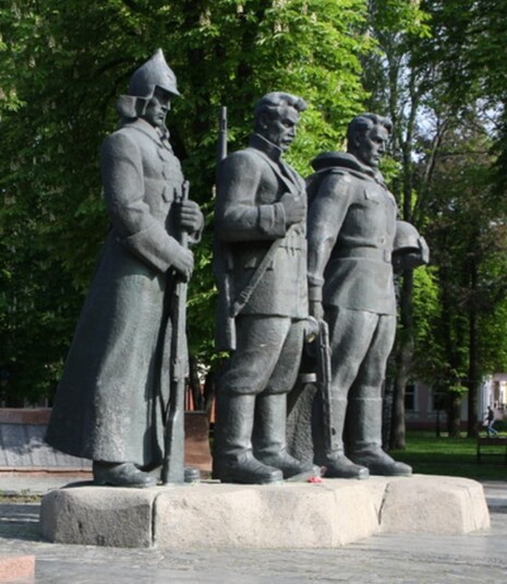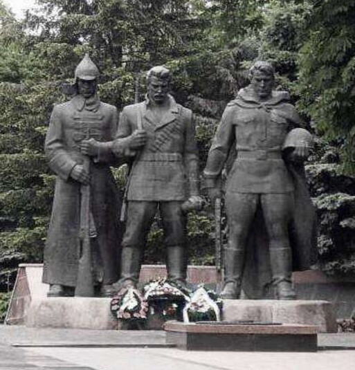 Скульптурна композиція із трьох чоловічих фігур з'явилася у Вінниці в сквері ім. Козицького в 1958 році. Вона зображає бійців радянської армії часів Жовтневого перевороту 1917 року, так званої громадянської війни та Другої світової (в інтерпретації авторів монумента – Великої Вітчизняної).