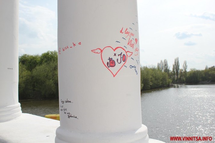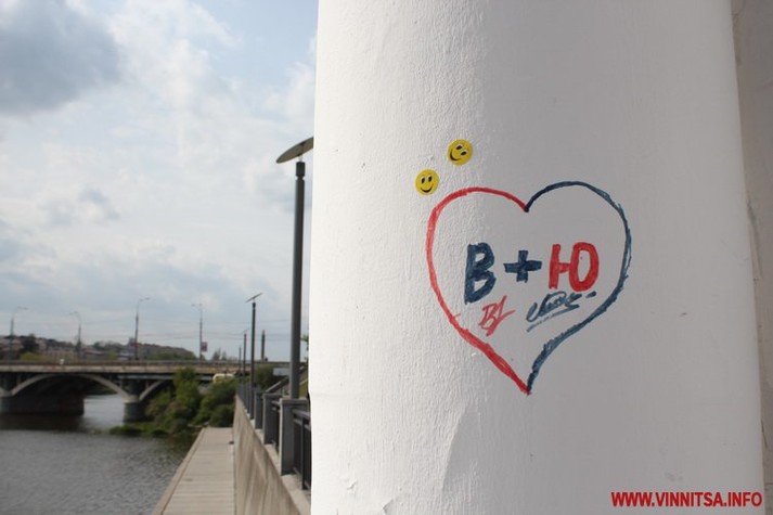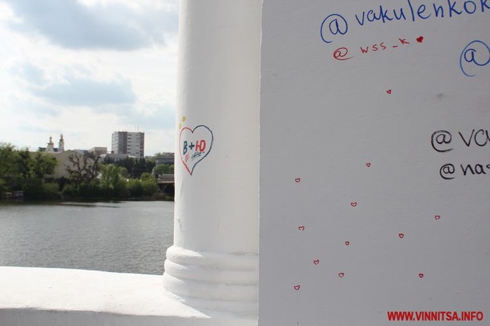 Й дійсно, колони там розписані не лише адресами. Смайлики, пташки, сердечка, зізнання у коханні. На поручні арки сидить високий хлопець років до 25-ти. Гризе зернята. Лузгу кидає під ноги.