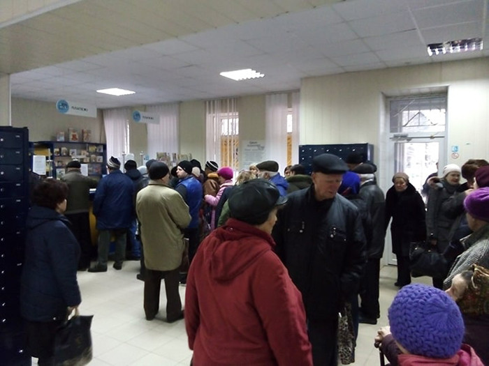 Біля відділення №30 Укрпошти, що на проспекті Юності у Вінниці, містяни чи не удосвіта займають чергу, щоб вчасно розрахуватися за спожиті послуги. У ній годинами простоюють пенсіонери, інваліди та інші споживачі. Кому починає бракувати кисню, на якийсь час виходять подихати на вулицю.