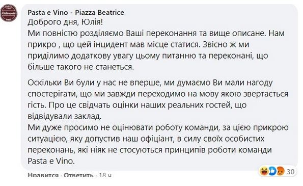Незабаром після публікації поста керівництво ресторану відповіло на зауваження у коментарях і пояснило свою позицію. «Добрий день, Юлія! Ми повністю поділяємо ваші переконання і описане вище. Нам прикро, що цей інцидент мав місце. Звичайно ж, ми приділимо додаткову увагу цьому питанню і переконані, що більше такого не станеться. Ми дуже просимо не оцінювати роботу команди по цій прикрій ситуації, яку допустив наш офіціант, в силу своїх особистих переконань, які ніяк не відносяться до принципів роботи команди Pasta e Vino», – сказано в повідомленні.
