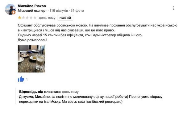 Йдеться про відгук, який написав у відгуках про ресторан Михайло. Він поскаржився, що його відмовилися обслужити українською. Замість вибачень власники ресторану порадили Михайлу переходити на італійську, адже вони італійський ресторан.