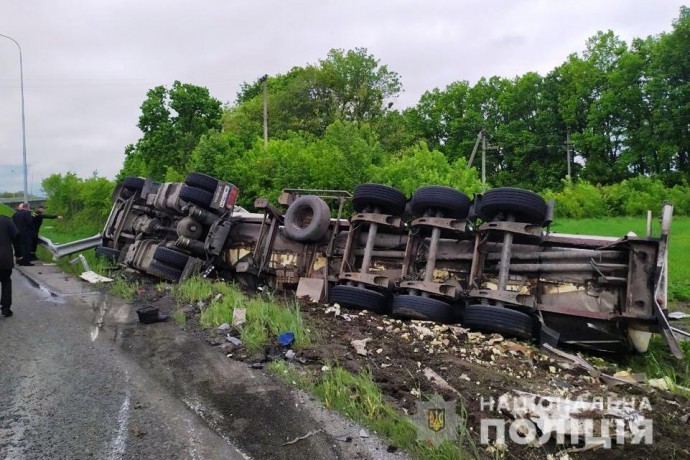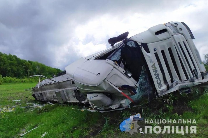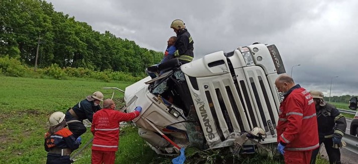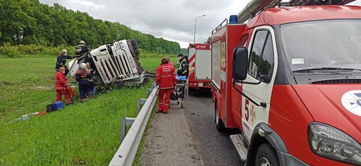 Водій вантажівки, який перевозив олію, не впорався з керуванням та з’їхав з дороги. Внаслідок автопригоди цистерна перекинулась. Кермувальника затисло в кабіні авто.