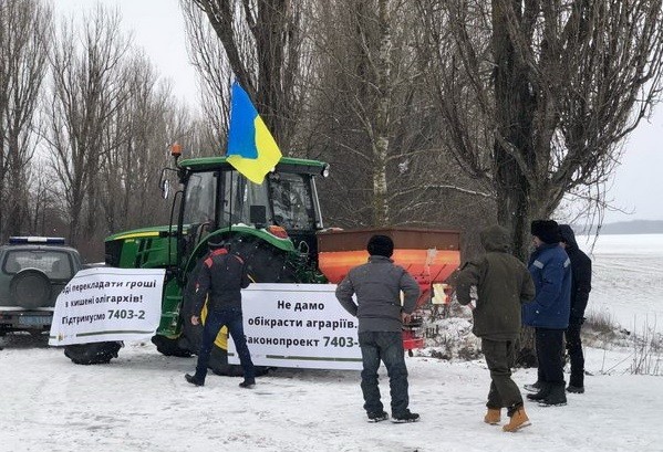 Протестувальники городили дорогу сільськогосподарською технікою і вимагали від Верховної Ради підтримати законопроект №7403-2, яким пропонується зберегти експортне відшкодування ПДВ при експорті сої та ріпаку.