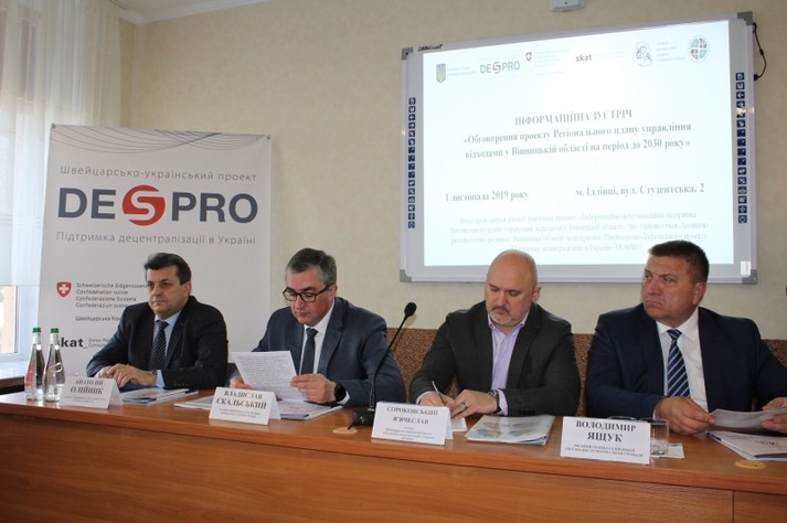 За участі голови обласної Ради Анатолія Олійника, голови облдержадміністрації Владислава Скальського та офіційної делегації швейцарсько-українського проєкту «Підтримка децентралізації в Україні» DESPRO на чолі з Юргом Крістеном відбулась презентація та обговорення першого в Україні Регіонального плану управління відходами у Вінницькій області.