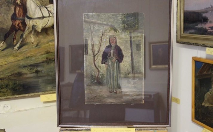 Фахівець також ознайомив присутніх із особливостями роботи, наповненої досить стриманими кольорами. У центрі уваги молода дівчина – кримська татарка у національному вбранні: в сукні «антер», накидці («кірха» або «хірха»), темно-вишневий колір якої свідчить про знатне походження дівчини, а також у головному уборі «фес».