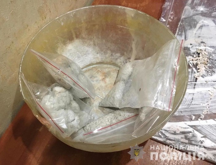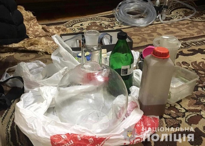 Під час проведення санкціонованого обшуку у помешканні одного з затриманих працівники поліції вилучили близько 500 грам наркотичного порошку, схожого на амфетамін, електронні ваги, колби, пробірки, інше приладдя та прекурсори для його виготовлення.