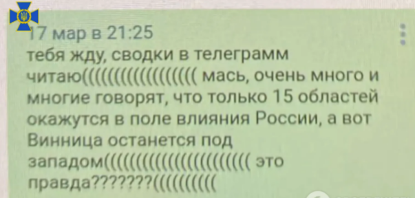 Як повідомляє управління Служби безпеки у Вінницькій області, фігурантка давно познайомилася й підтримувала контакт із бойовиком терористичної «ДНР» Андрієм. Вона хвалила армію РФ і журилася, що Вінниця в підсумку війни «може залишитися під впливом Заходу».