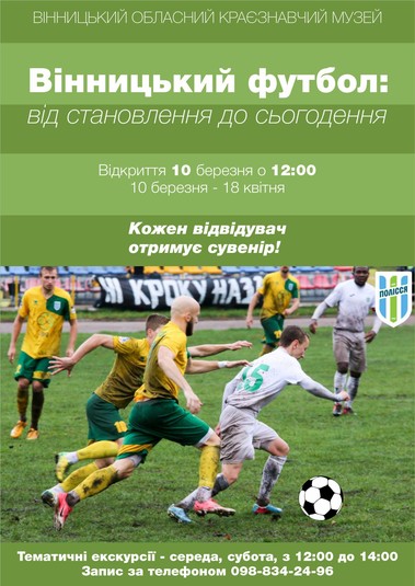 Виставка називається «Вінницький футбол: від становлення до сьогодення». Це особисті речі гравців, футбольні м’ячі та футболки, афіші і програми матчів різних років, кубки та фотознімки – загалом близько 300 оригінальних експонатів.