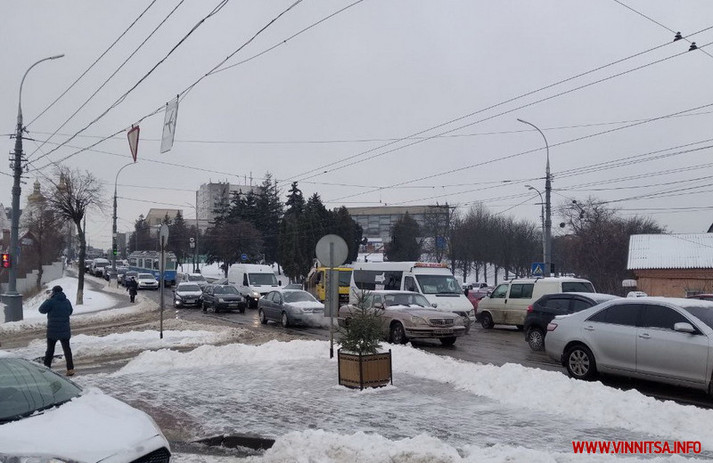 Через несприятливі погодні умови рух транспорту в центральній частині міста ускладнено, передає Вінниця.info.