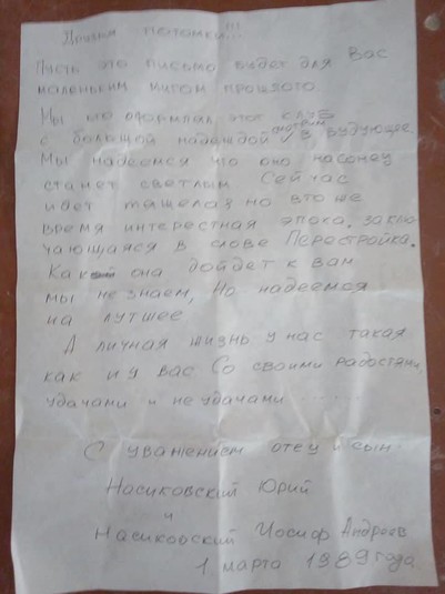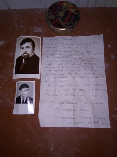 «Коли під час демонтажу однієї з плит впала та коробочка, завідувачка будинком культури спочатку подумала, що знайшли скарб. Замріяно почала планувати, за рахунок дорогоцінностей зроблять у БК найкращий ремонт на Вінниччині. Знаєте, як у тому романі Ільфа і Петрова «12-ть стільців». Та коли відкрили коробочку, вона називається монпансьє, а вона була акуратно вимита, вичищена, навіть не проіржавіла, побачили дві фотографії. Ще листа на російській мові датований 1 березня 1989 роком. На зворотному боці було написано українською: «Хай живе вільна Україна!». Та намальований наш тризуб. Це послання залишили батько і син Насиковські. 30 років тому вони проводили ремонт у нашому Будинку культури», - розповідає Юрій Мельник, голова об’єднаної громади села Могилівка.