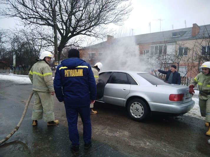 Вогнем пошкоджено відсік двигуна та панель приладів легкового автомобіля Audi.