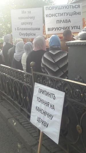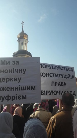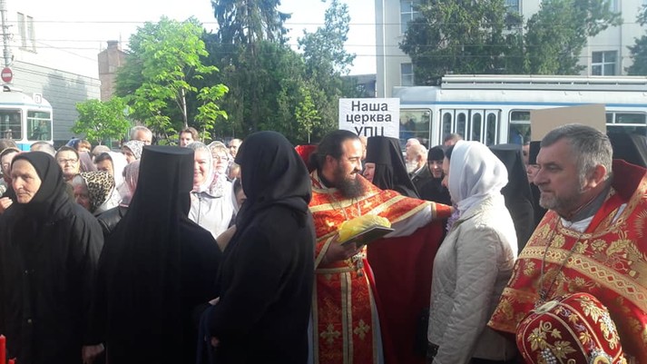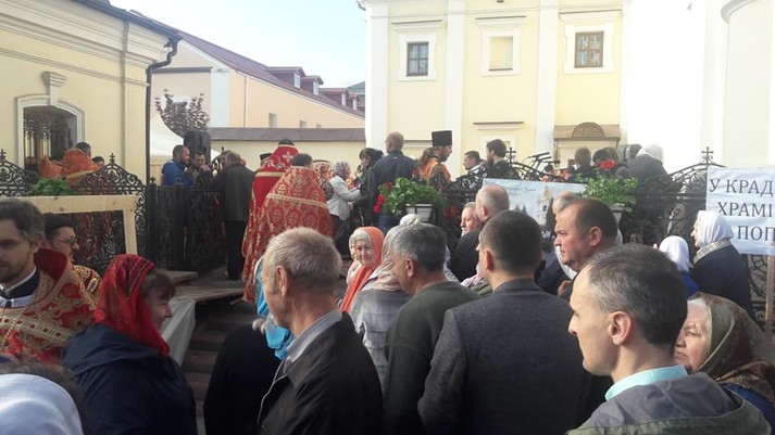 У той час, як всередині храму ПЦУ проходила служба, прихильники Московського патріархату демонстративно намагалися показати, що у них «вкрали» собор, а також виступали на захист своєї церкви, називаючи саме її «канонічною», і за підтримку предстоятеля Онуфрія.