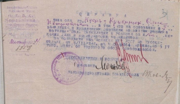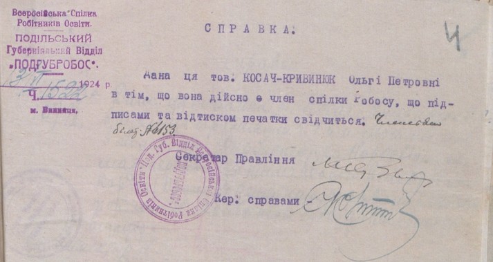 Найбільше документів в архіві пов’язано з сестрою і найближчим другом поетеси, її першим біографом і перекладачем Ольгою Косач-Кривинюк. На початку 20-х років минулого століття вона вчителювала у могилів-подільській трудовій школі, де організувала драмгурток і ставила вистави Олени Пчілки.